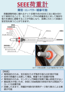 ワイヤロープは現場で加工するため、ロープの設置角度や設置位置を自由に設定でき、角度調整台座や荷重計の有無等、頭部状況に寄らず、取付が可能です。