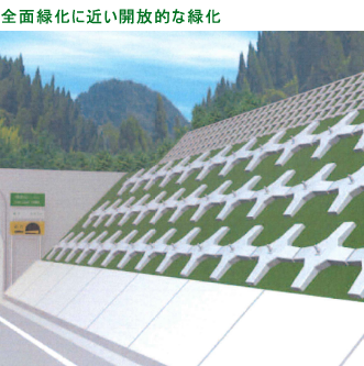 従来のPC製受圧板と比較し、約半分の厚さ(板厚;150~260mm)ですので、全面緑化に近い開放的な緑化が可能です。また、コンクリート製品であるため、擁壁などコンクリート構造物の補強に際しても景観を損ないません。