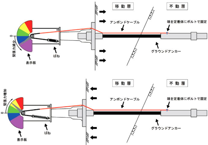 - シースに包まれたアンボンドケーブルをアンカーに沿って配置し、移動層の変位によるアンカーの伸縮をアンボンドケーブル経由でばねの変位として検出するシンプルな構造です。
