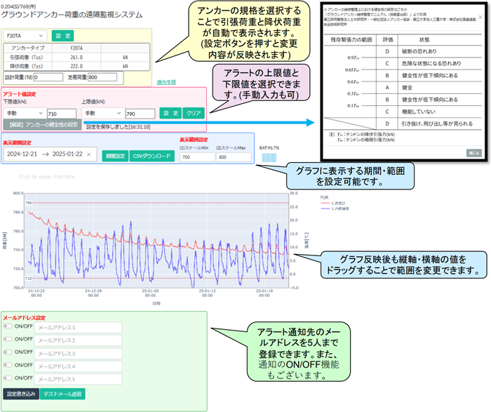 - SEEE荷重計、専用の無線通信機能付きデータロガー、WEB上の管理画面で構成されており、アンカー残存引張り力の変化をPCやスマートフォンで確認できます。