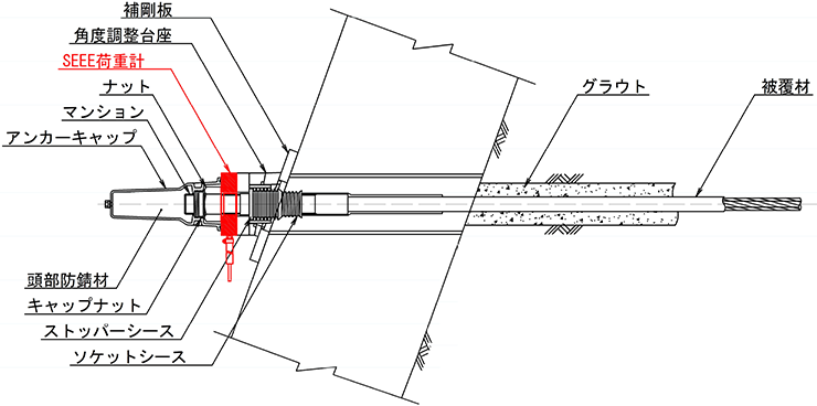 - 荷重調整性能に優れるナット定着方式のSEEE工法と組み合わせて使用することで、モニタリング中の荷重変化に対して残存引張力を適切に調整できます。
